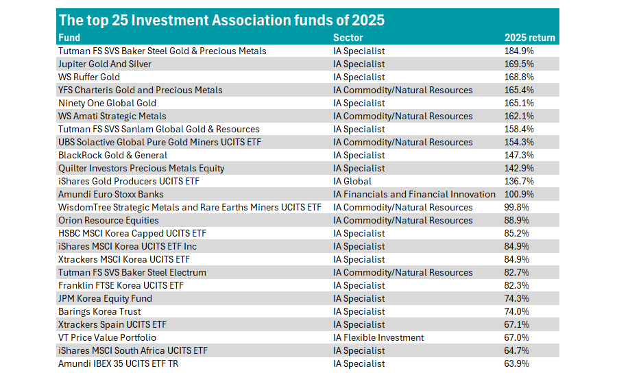 Funds with exposure to precious metals dominated the list of top-performing strategies in 2025, Trustnet found.